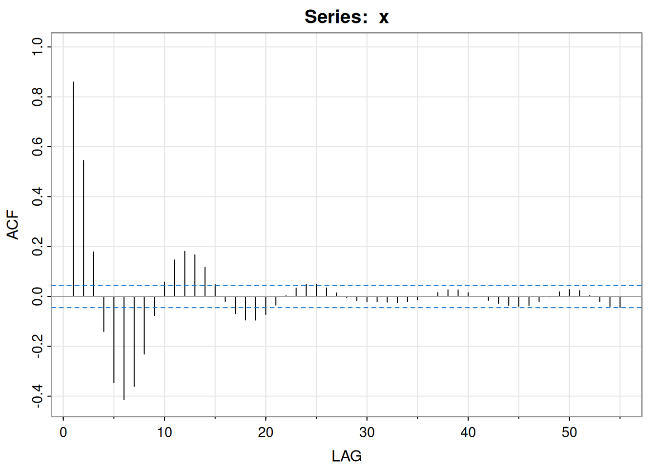 acf1(x) [1] 0.86 0.55 0.18 -0.14 -0.35 -0.41 -0.36 -0.23 -0.08 0.06 0.15 0.18
