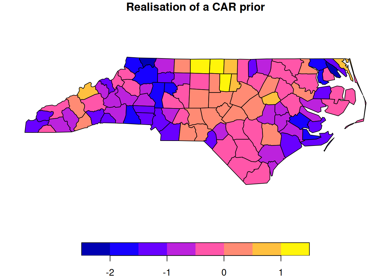 nc["car"]=z# add CAR sample to spatial data frameplot(nc["car"], main="Realisation of a CAR prior")