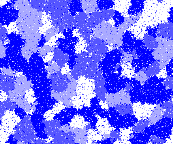 \] For large \(n\) it is essentially impossible to directly simulate exact realisations from this model, but it is very straightforward to use a Gibbs sampler to generate MCMC samples. Below is a realisation of a Potts model on a \(600\times 500\) regular square lattice, generated using a Gibbs sampler, with \(K=4\) states shown as different shades of blue.
