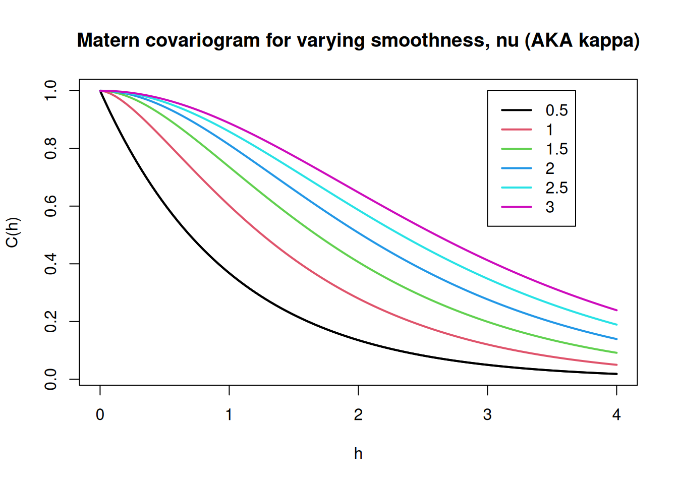 In the context of geostatistics, the Matérn covariance function is a very useful, flexible class of covariograms determining (weakly) stationary random fields with varying smoothness levels. At first sight it appears a little intimidating, due to the involvement of a Bessel function, but ultimately it is just a 3-parameter covariance function class, with a variance, scale, and roughness/smoothness parameter. The correlation function is available as a simple R function as geoR::matern (which in turn exploits base::besselK). We will use this function to get a better feel for the Matérn family.