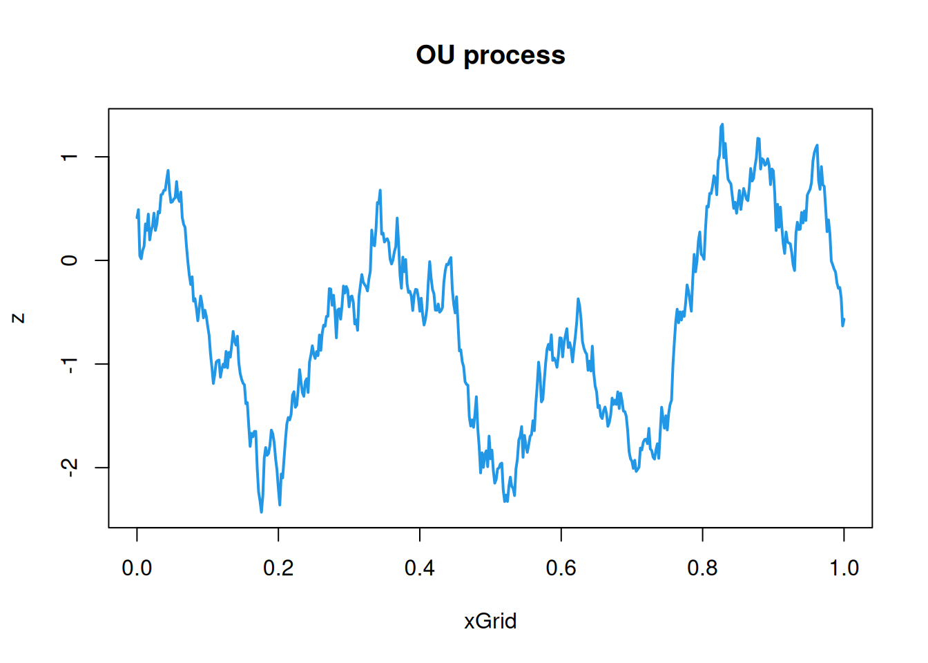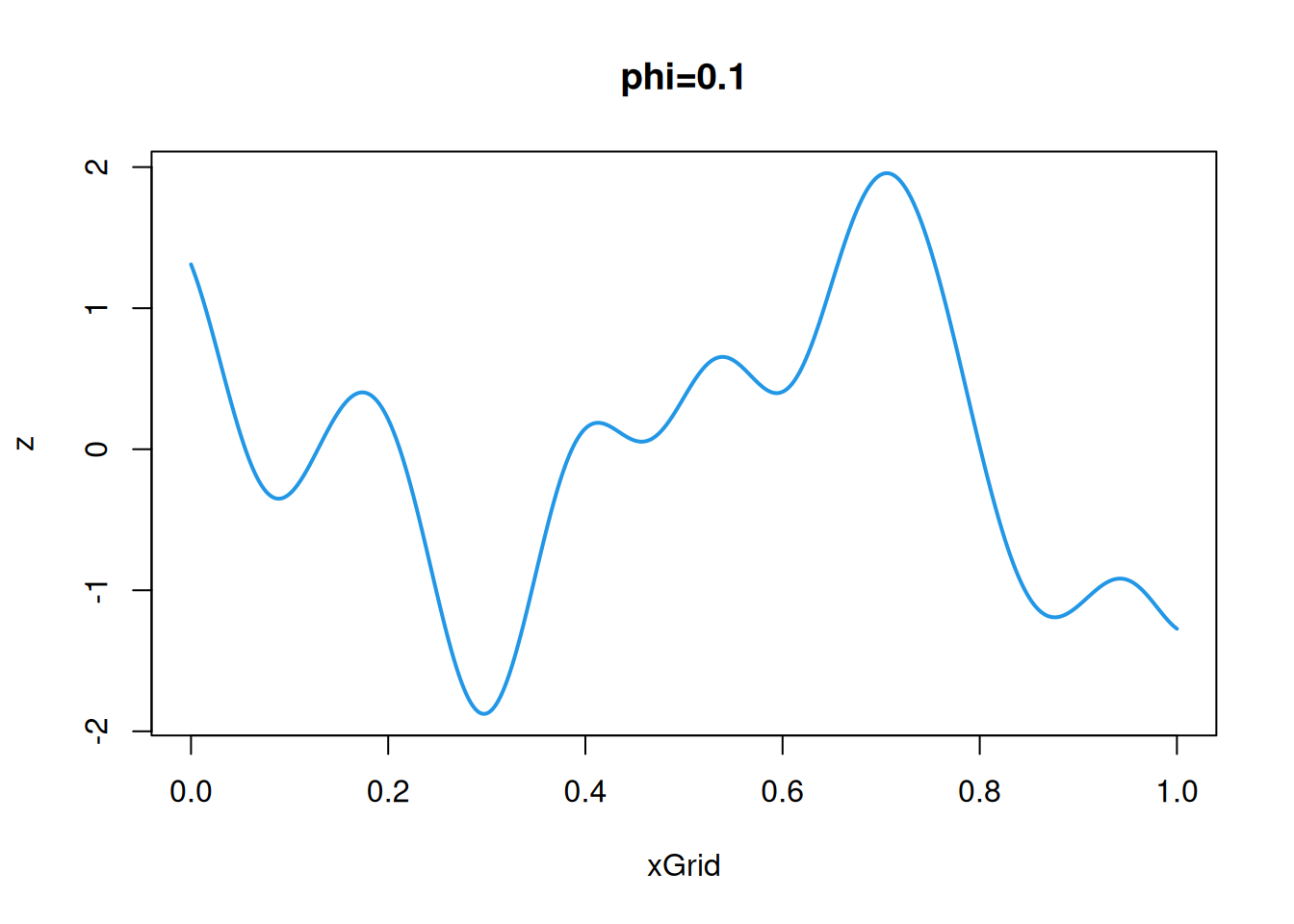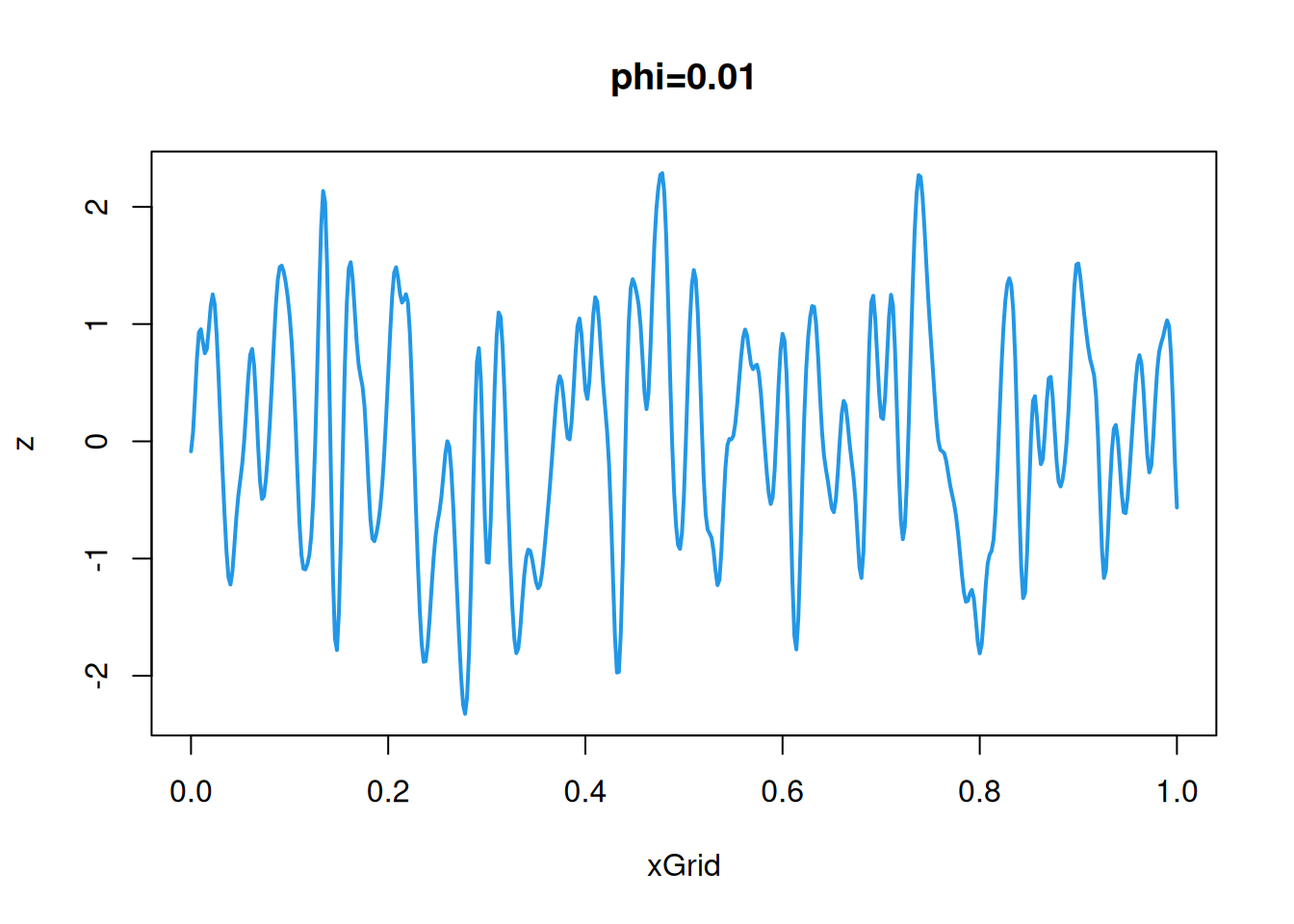 cf=function(h)exp(-64*h^2)# covariance/covariogram functionz=mvtnorm::rmvnorm(1, sigma=cf(hMat))# single sample from a MVNplot(xGrid, z, type='l', col=4, lwd=2)# plot the realisation