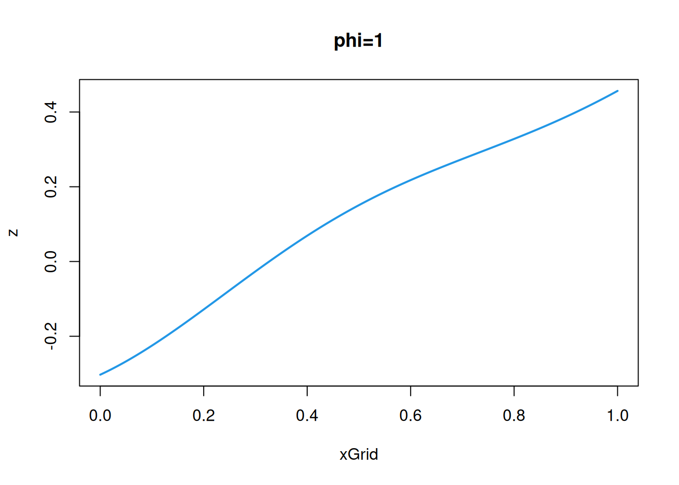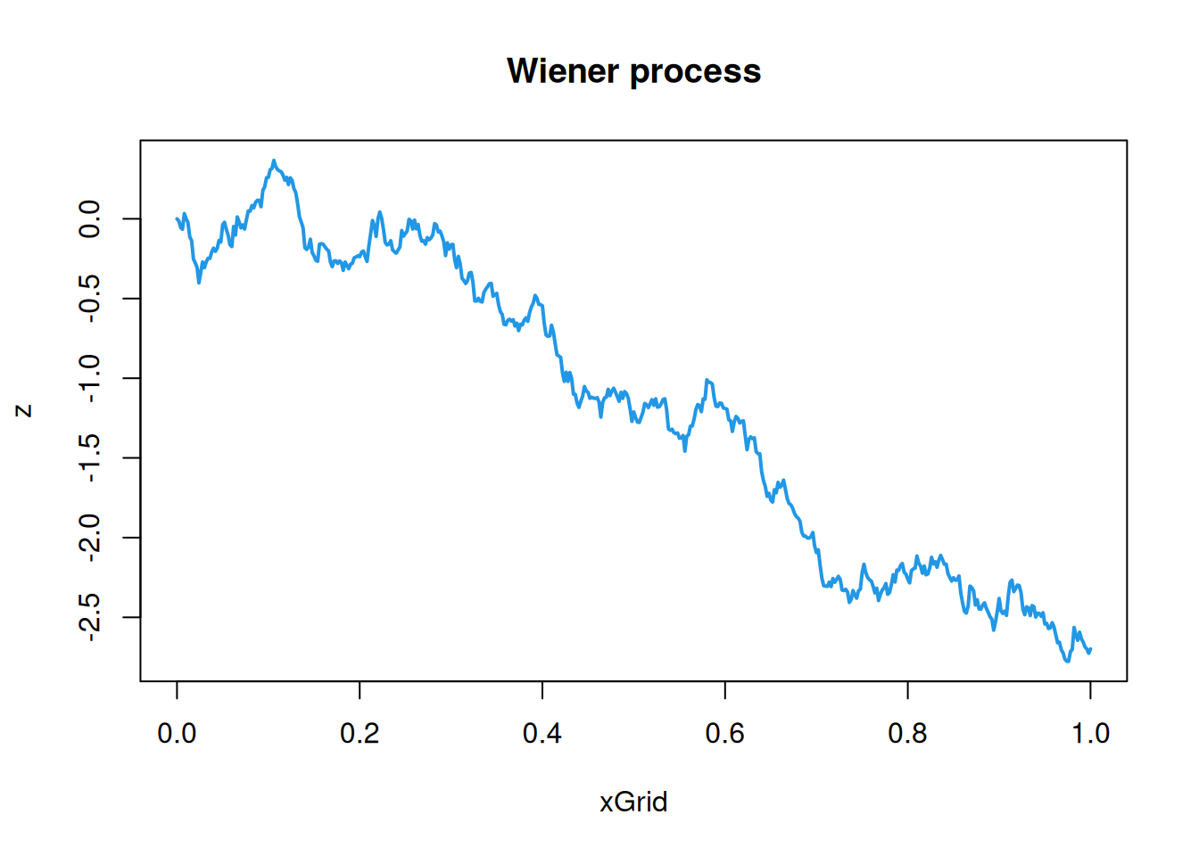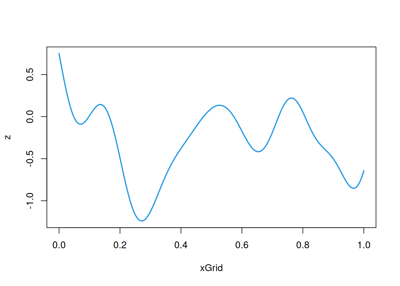 cf=function(h)exp(-64*h^2)# covariance/covariogram functionz=mvtnorm::rmvnorm(1, sigma=cf(hMat))# single sample from a MVNplot(xGrid, z, type='l', col=4, lwd=2)# plot the realisation