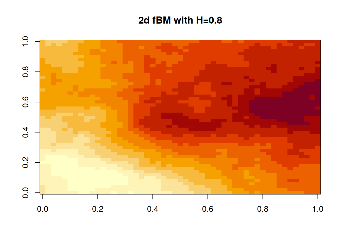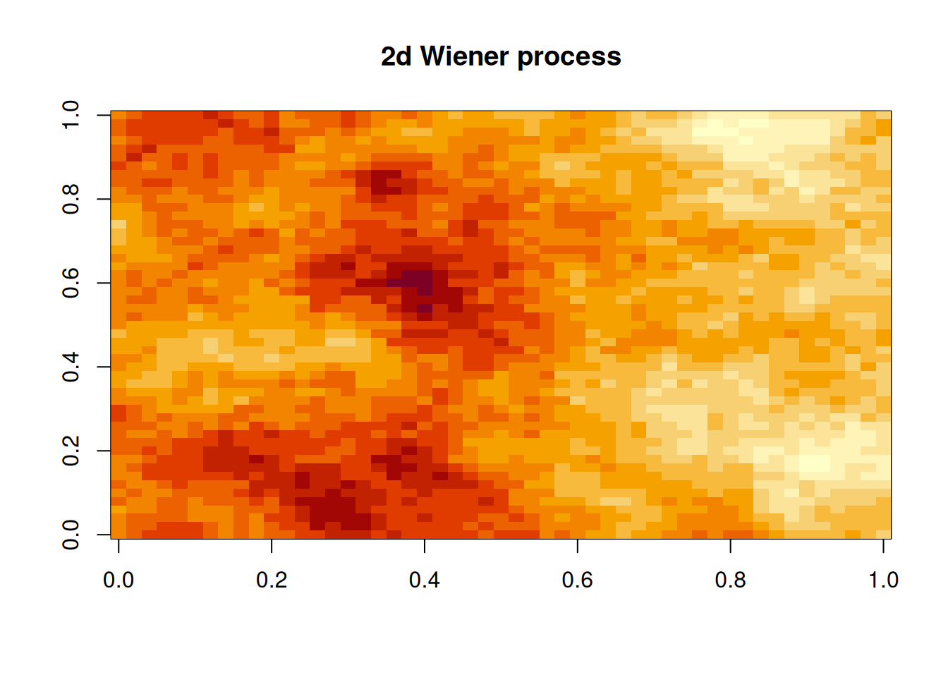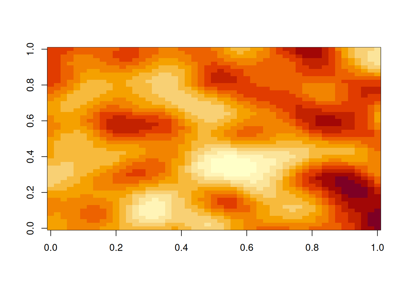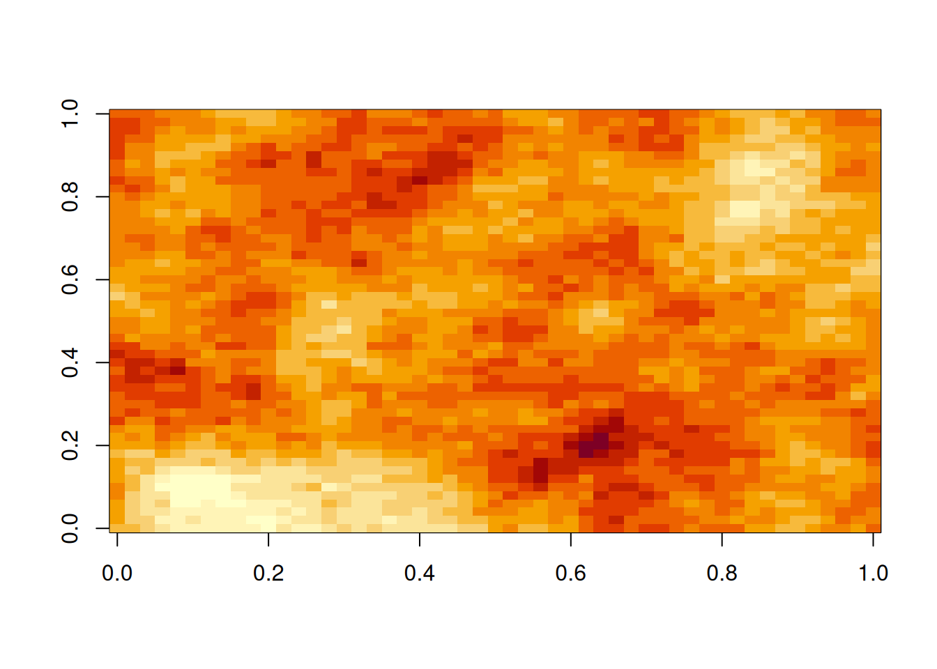 hMat=as.matrix(dist(xyGrid))# matrix of pairwise Euclidean distancescf=function(h)exp(-64*h^2)# covariogram function (as a function of distance)zVec=mvtnorm::rmvnorm(1, sigma=cf(hMat))# single sample from a MVNz=matrix(zVec, nrow=length(xGrid))# wrap vector into a matriximage(z)# plot the matrix as a colour image
