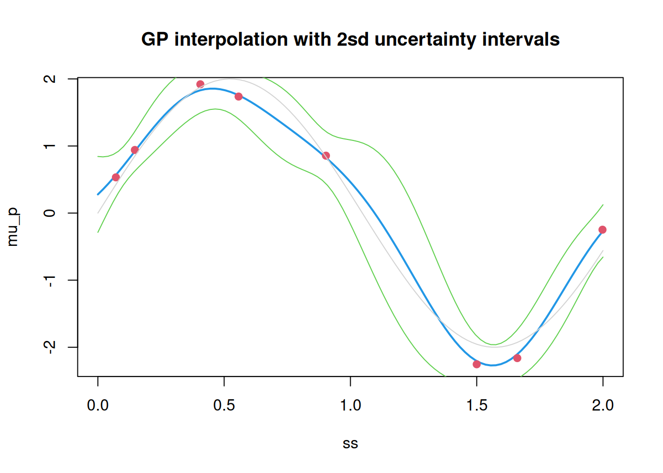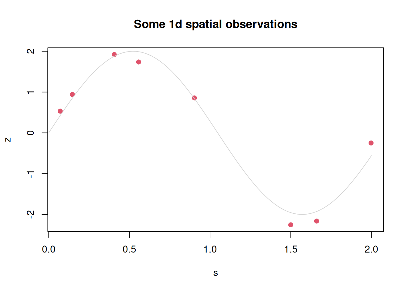n=8# number of observationss=runif(n, 0, 2)# random observation sitesz=2*sin(3*s)+0.2*rnorm(n)# some fake observationsplot(s, z, pch=19, col=2, main="Some 1d spatial observations")curve(2*sin(3*x), 0, 2, add=TRUE, col="lightgrey")