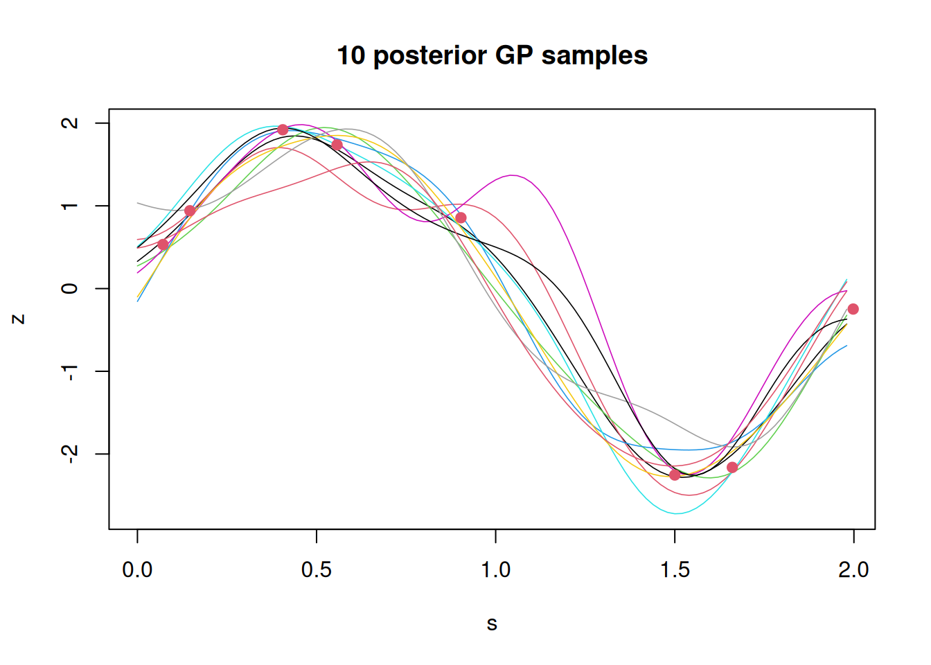 m=100# grid resolution (for unobserved locations of interest)ss=seq(0, 2, length =m)s_all=c(ss, s)# combined vector of unobserved and observed locationsd=as.matrix(dist(s_all))# full joint distance matrixcf=function(h, phi)# squared exponential covarianceexp(-(h/phi)^2)C_all=cf(d, 0.4)# full joint covariance matrixnv=0.2^2# nugget variance (can be 0)C_all[(m+1):(m+n), (m+1):(m+n)]=C_all[(m+1):(m+n), (m+1):(m+n)]+nv*diag(n)