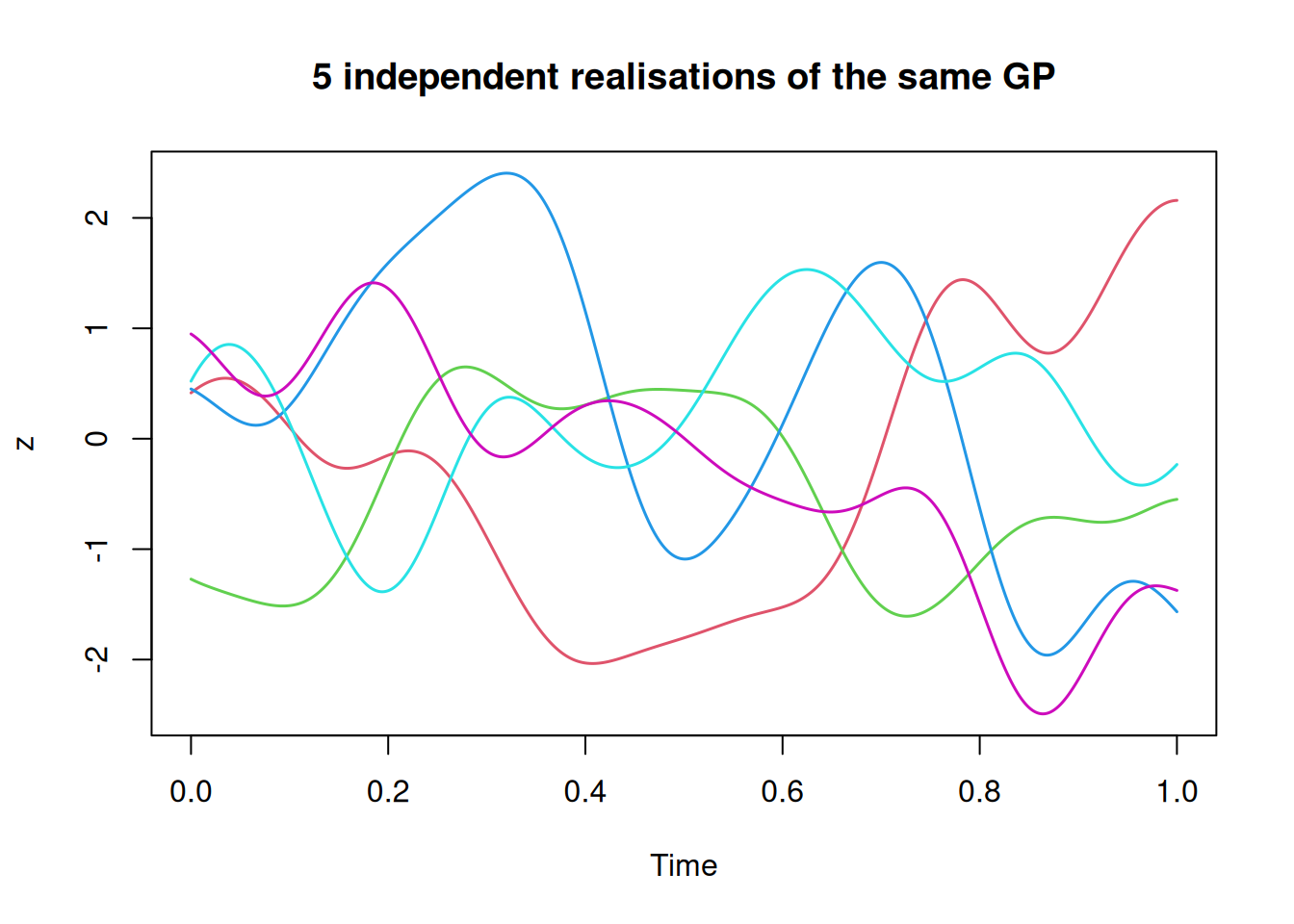 z=mvtnorm::rmvnorm(5, sigma=cf(hMat))# 5 independent samples from a MVNplot(ts(t(z), start=0, deltat=0.002), plot.type="single", col=2:6, lwd=1.5, ylab="z", main="5 independent realisations of the same GP")
