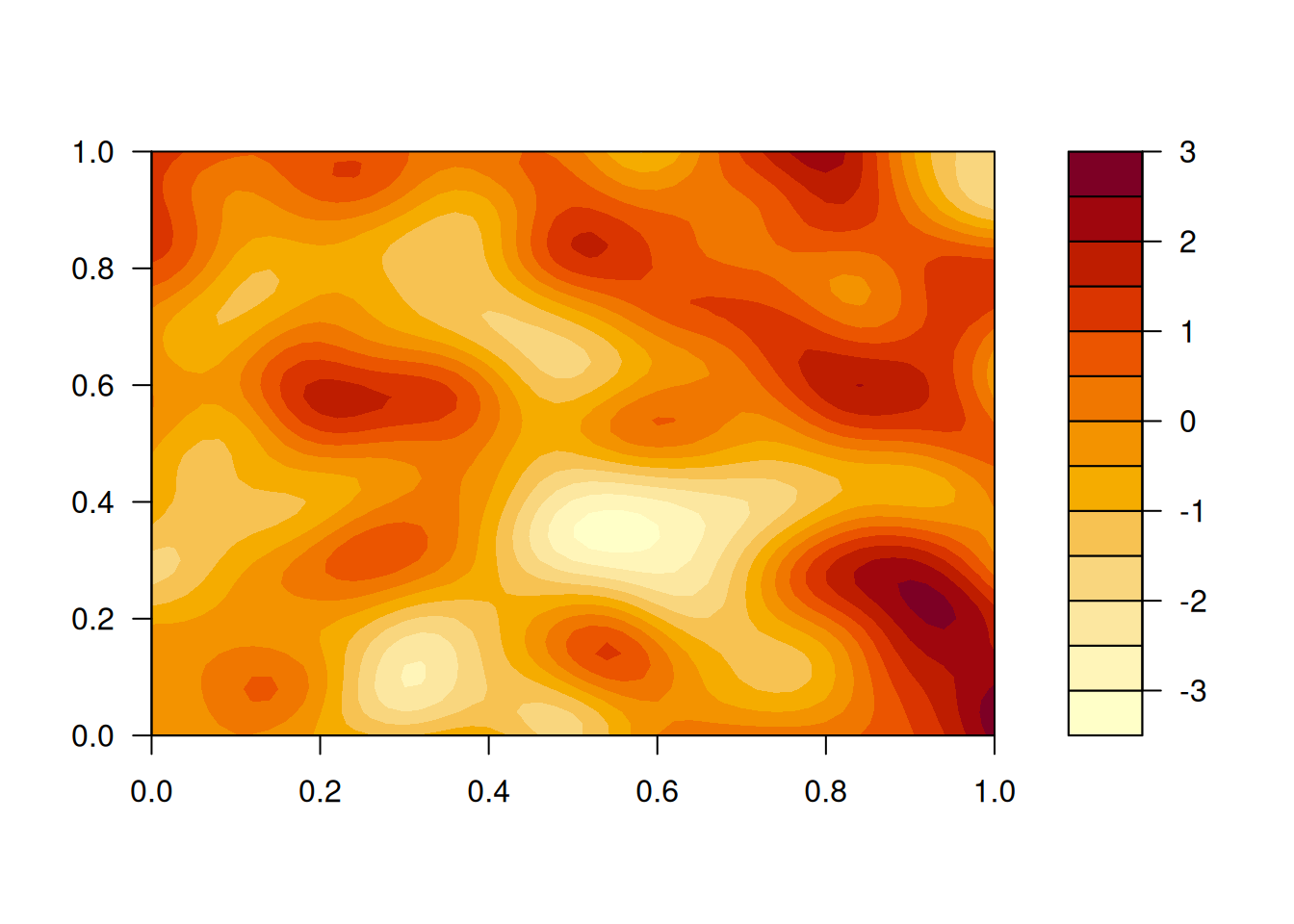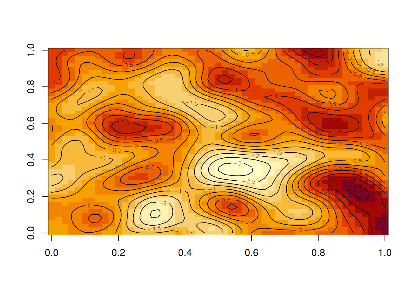 If we want, we can overlay contours on top of the image. Alternatively, we can use the filled.contour function, which works well for smooth GPs, but less well for GPs with rough realisations.