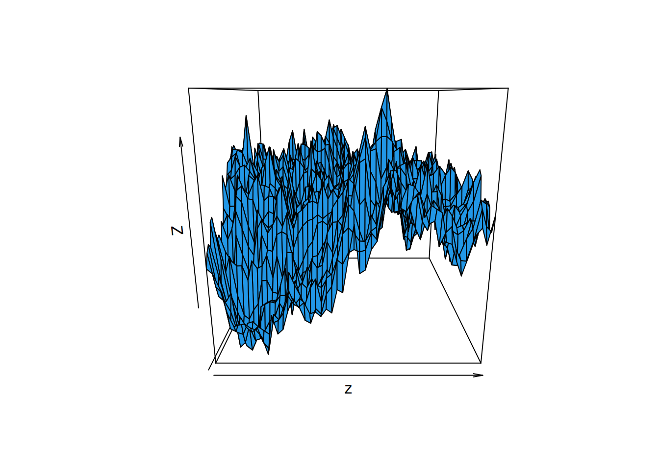 Again, we should be cautious due to the coarseness of the grid, but this surface appears to be continuous but not differentiable. It is therefore rough, whereas the surface associated with a squared-exponential covariogram is smooth.