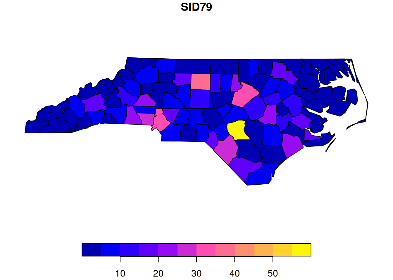region.id=as.character(nc$FIPS))We will consider the spatial variable SID79, representing a count of the number of SIDS events in each county in a given time window.