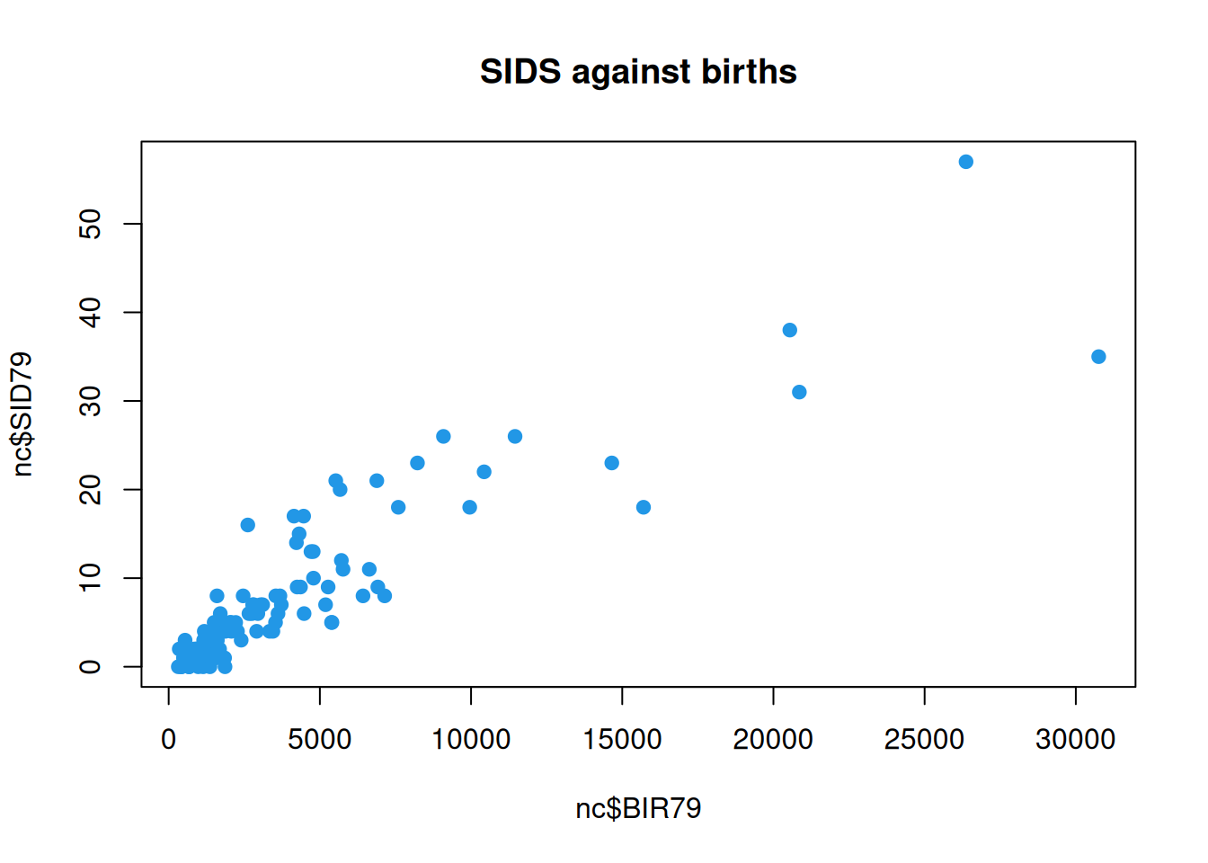 Unsurprisingly, we now see that the counties with the high numbers of SIDS events are also the counties with high numbers of births (presumably due to a larger resident population). We can do a scatter-plot of SIDS against births to confirm.