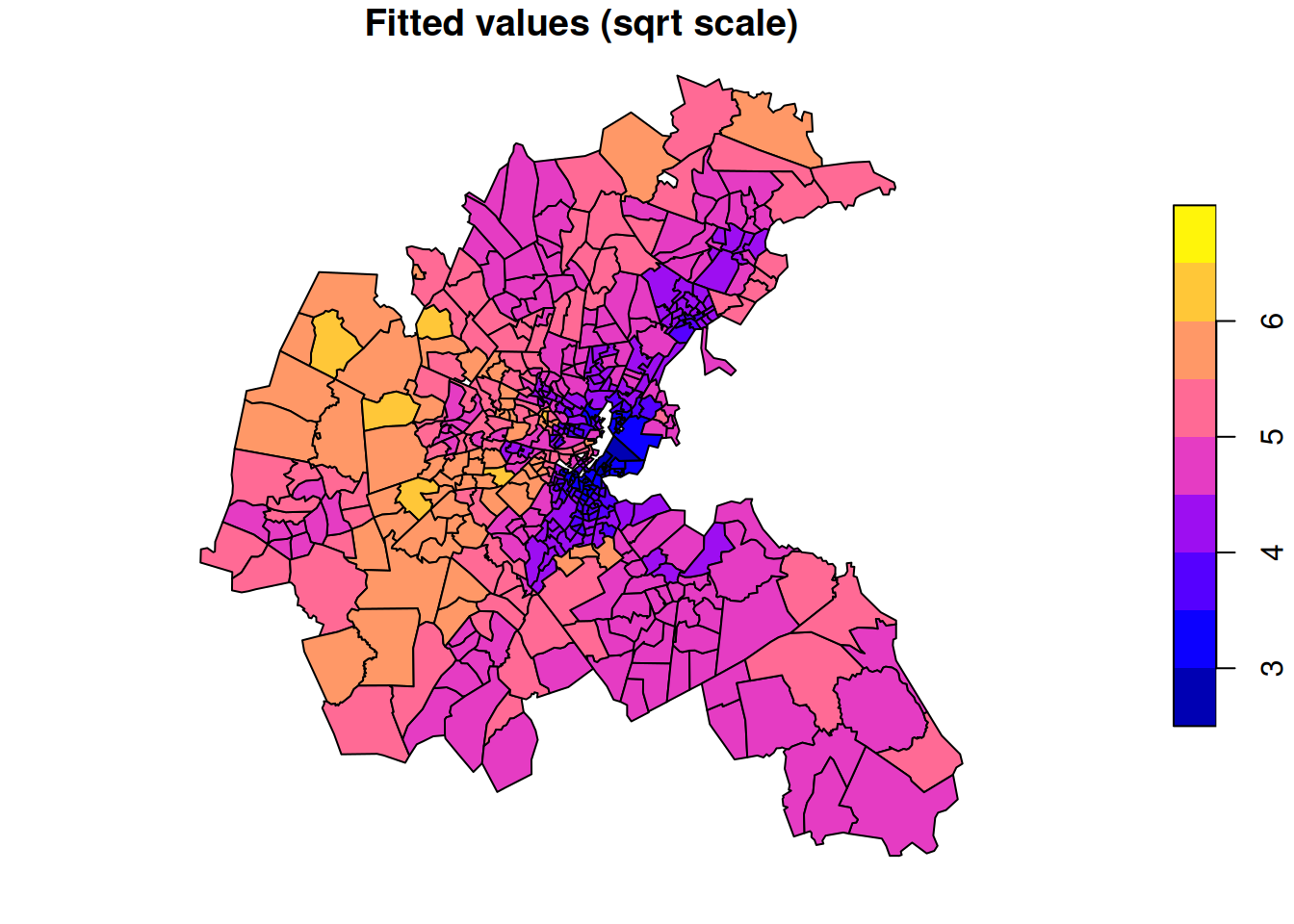 All of the usual regression modelling issues apply. We can see that the coefficients for both the crime and pollution variables are negative, suggesting that these are both negatively associated with house value (though as always, the direction of causation may not be clear). Lambda is the estimated spatial dependence parameter (values close to one indicate high spatial dependence). We can plot the fitted values in the usual way.
