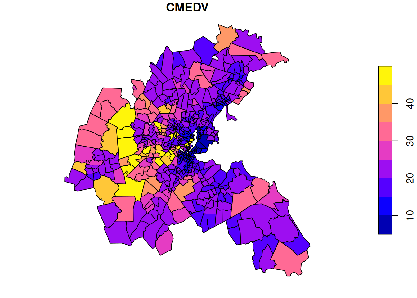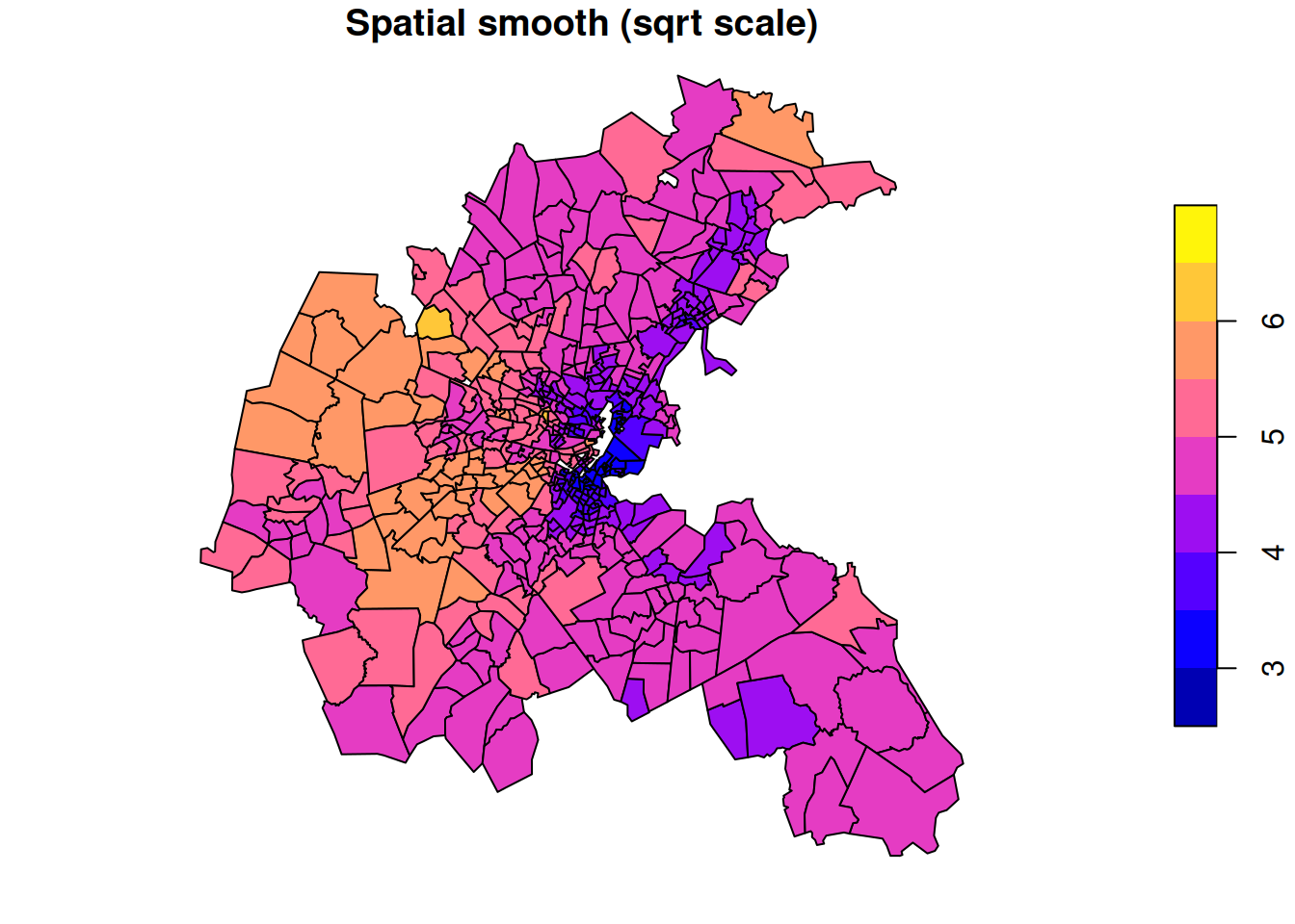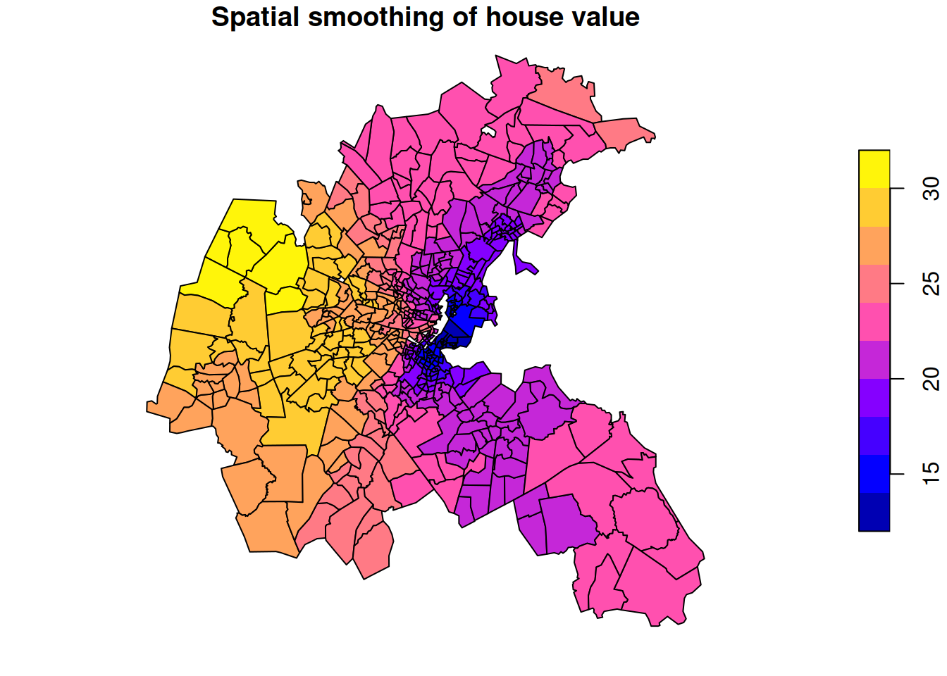 The data is median house price (in thousands of USD) for each area. The plot shows large variations in house prices from area to area, with some overall patterns, but interrupted by adjacent areas with high and low prices, respectively. We might think that house prices will tend to spatially equilibriate over time, so we might prefer to spatially smooth the data to get a better feel for which larger parts of the metropolitan area tend to have higher and lower prices, respectively.